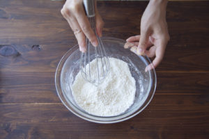 ボウルに白玉粉、牛乳を入れ、泡立て器でダマを潰すように混ぜ合わせる。