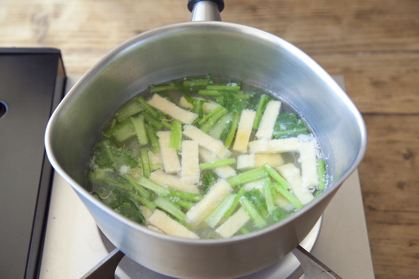 煮たったら1、油揚げを入れ、1〜2分ほど煮る。