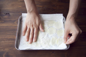 耐熱皿にクッキングシートを敷き、 じゃがいもを重ならないように並べ、