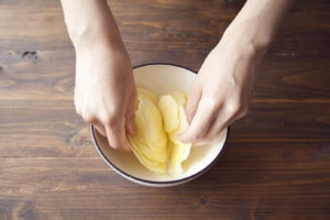 じゃがいもの水気をよく拭き取り、オリーブオイル、 しょうゆをまぶす。