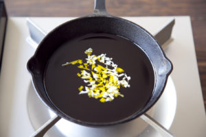 スキレット(小さいフライパンでも可)にオリーブオイル、にんにくを入れ、