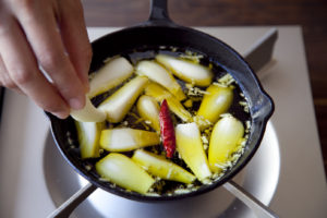 オイルとにんにく唐辛子、 塩と一緒にらっきょうを煮るだけで出来上がり!