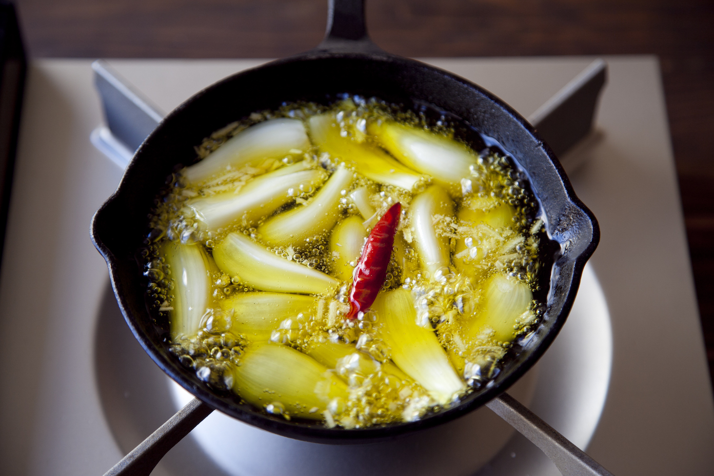 オイルとにんにく唐辛子、 塩と一緒にらっきょうを煮るだけで出来上がり!