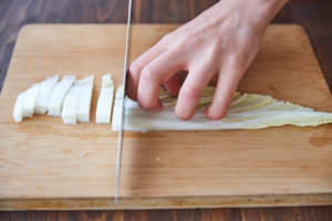白菜は幅1cmに切り、長いものは長さを半分に切る。ボウルに白菜を入れ、粗塩をしっかり揉み込み15分おく。