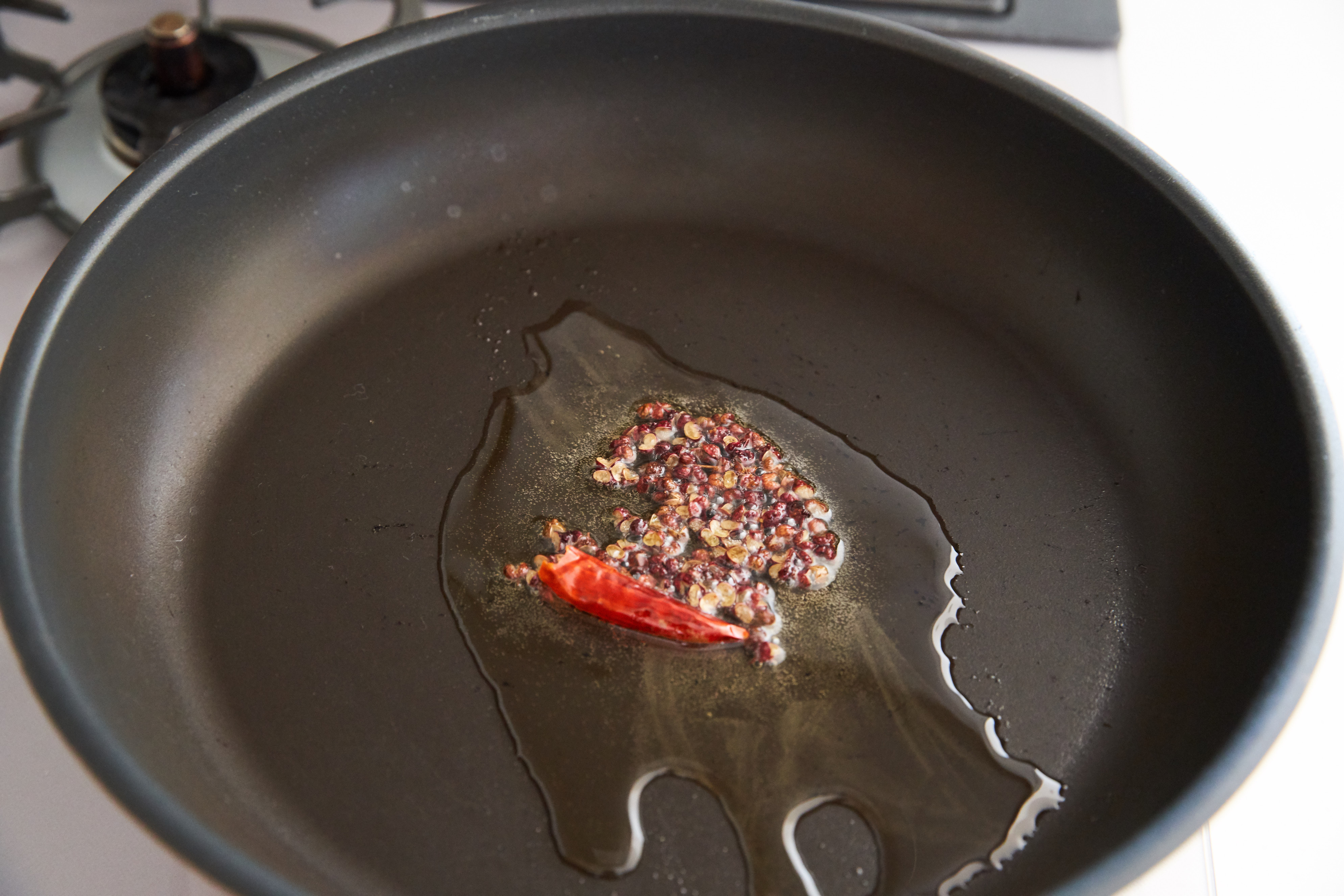 フライパンにごま油、花椒、赤唐辛子を入れ、強火にかける。煙が出て来たらすぐに2に回しかける。