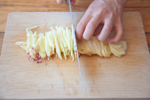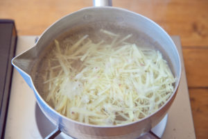 新生姜はスプーンで汚れている部分をこそげ、繊維に沿って細切りにする。