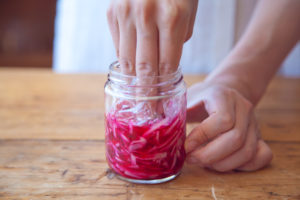 2の瓶に梅酢を注ぎ、汁に浸るようにラップを敷き込み、一晩おく。