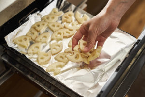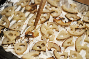 れんこんは皮ごと5mm幅のいちょう切りにする。