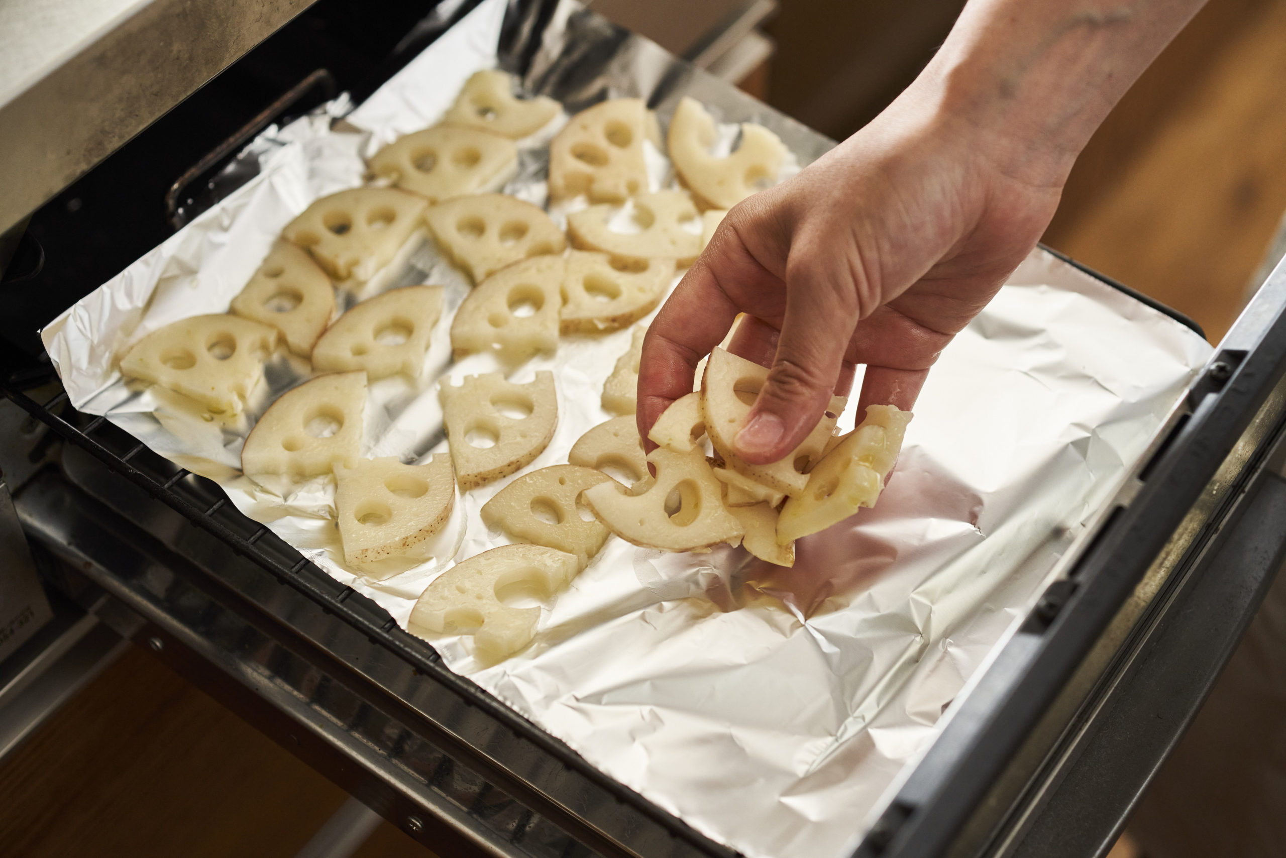 1のれんこんにオリーブオイル大さじ1をまぶしてアルミホイルにのせ、魚焼きグリルで7〜8分焼く。