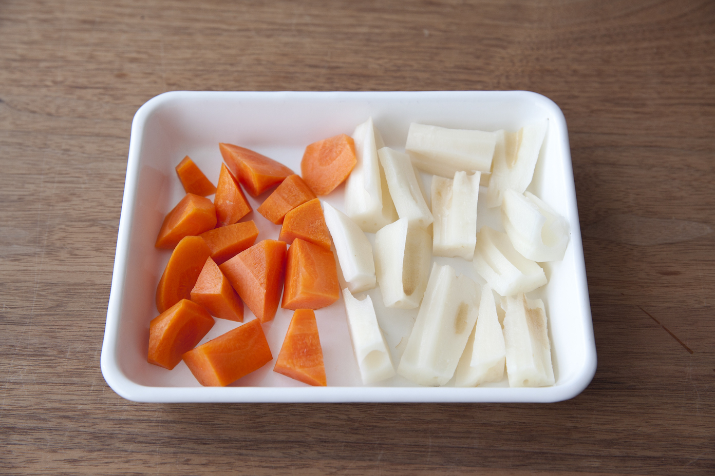 れんこんは繊維に沿って縦長に切る。にんじんは小さめの乱切りにする。