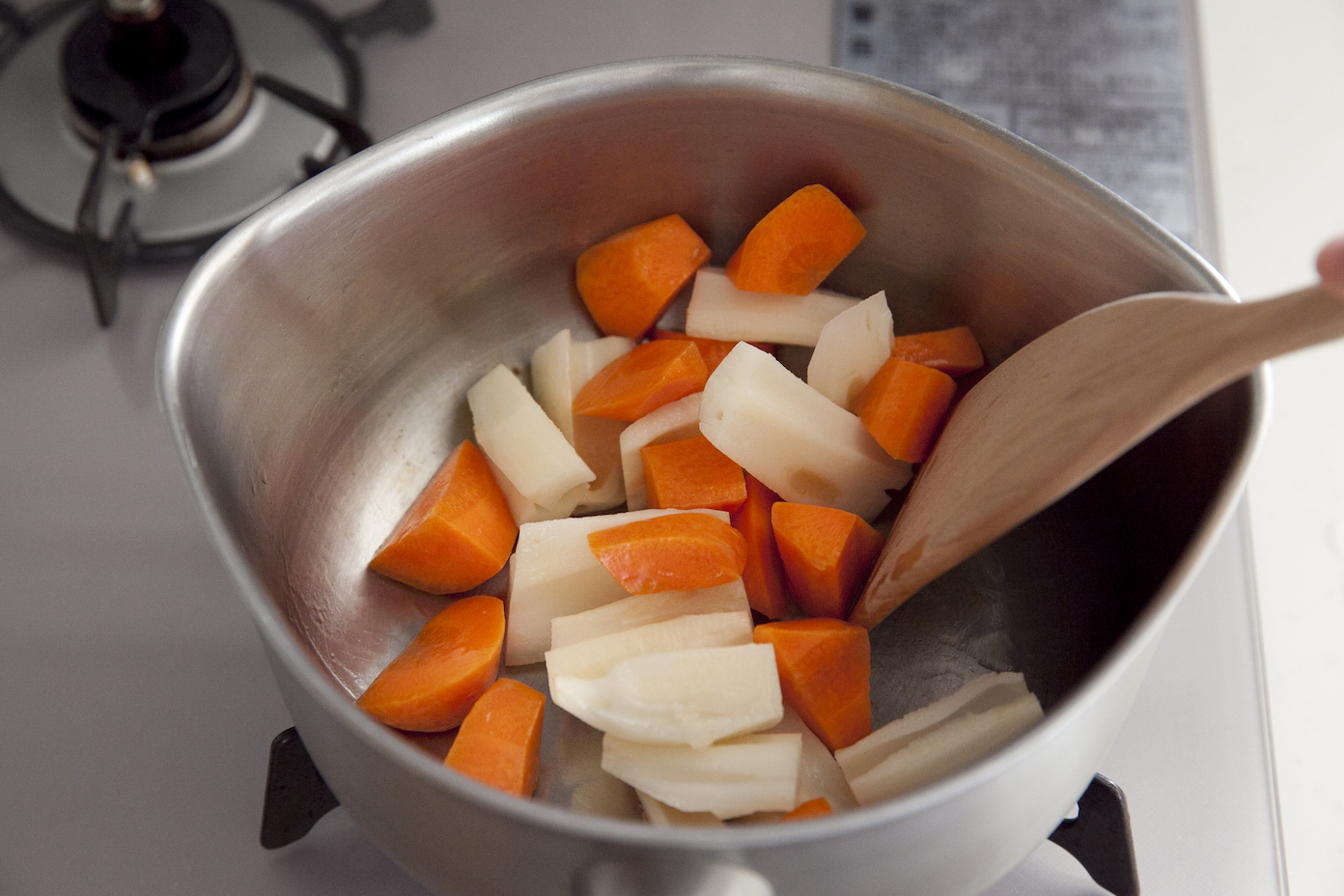 鍋にごま油を中火で熱し、れんこん、にんじんを炒める。