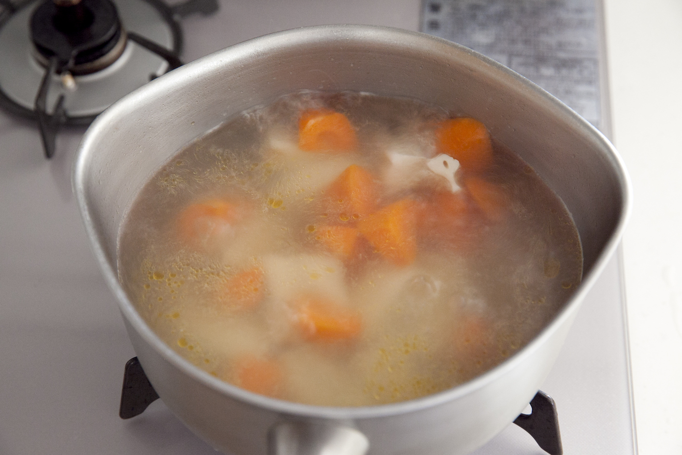 れんこん、にんじんに火が通ったら、火を止め、みそ、酒粕を溶き入れる。