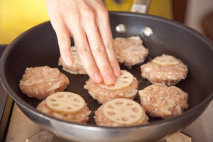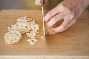 れんこんは8枚を2mmほどの輪切りにし(直径が大きいれんこんの場合はいちょう切り)、