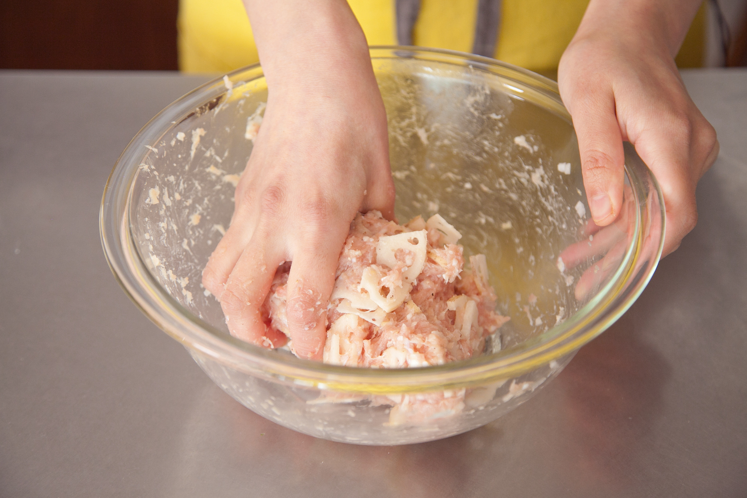 ボウルに鶏ひき肉、長ねぎ、(A)を入れてよく練り混ぜ、