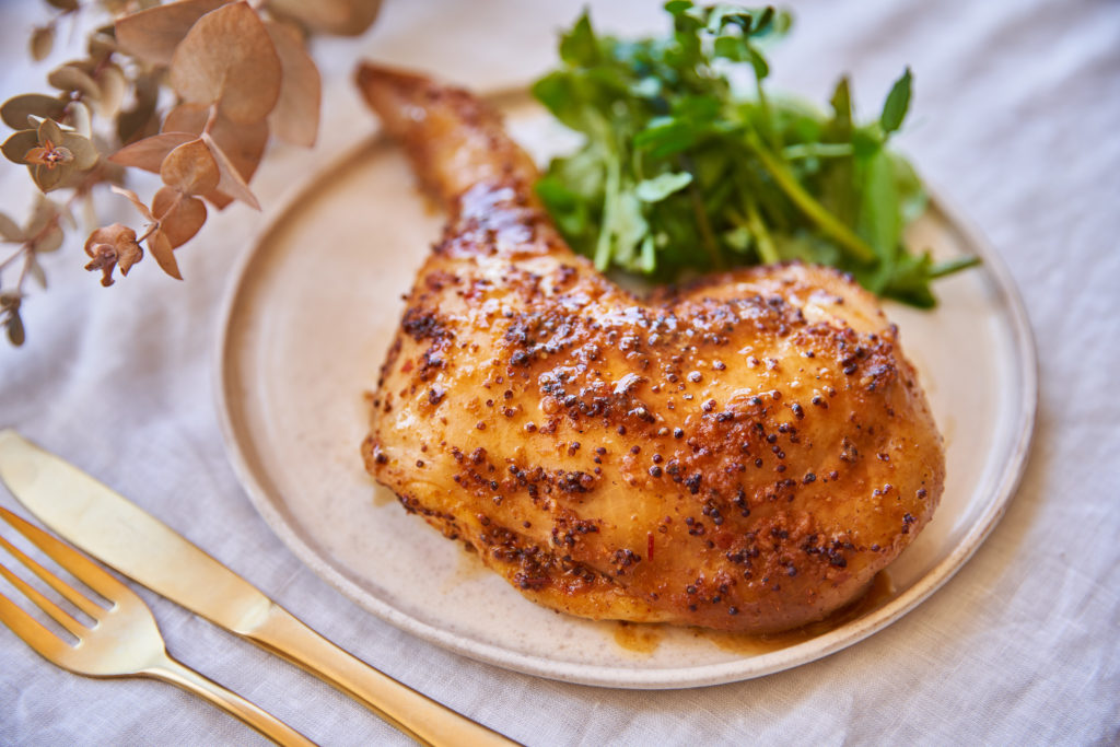 焼いている途中で肉汁をかけることで、皮目がパリッと仕上がります。