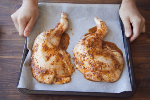 クッキングシートを敷いたオーブン皿に鶏肉をのせて残った漬け汁をかけ、