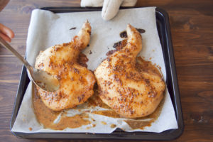 一度オーブンから取り出し、オーブン皿に出た肉汁を皮にかけて、ふたたび15分焼く。