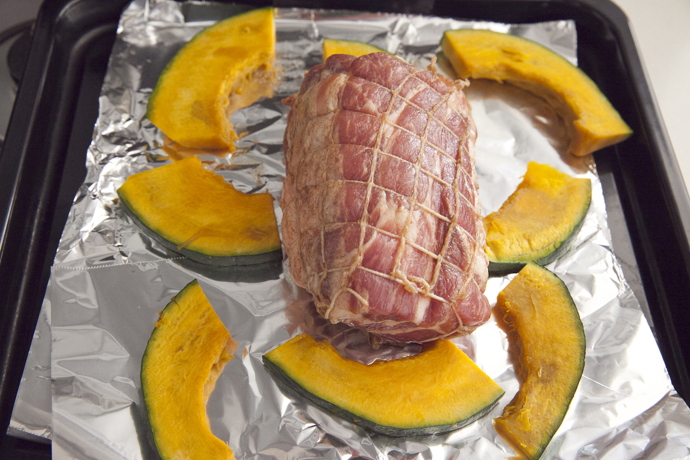 オーブン皿にアルミホイルをしき、かぼちゃ、豚肉をのせて20分焼く。