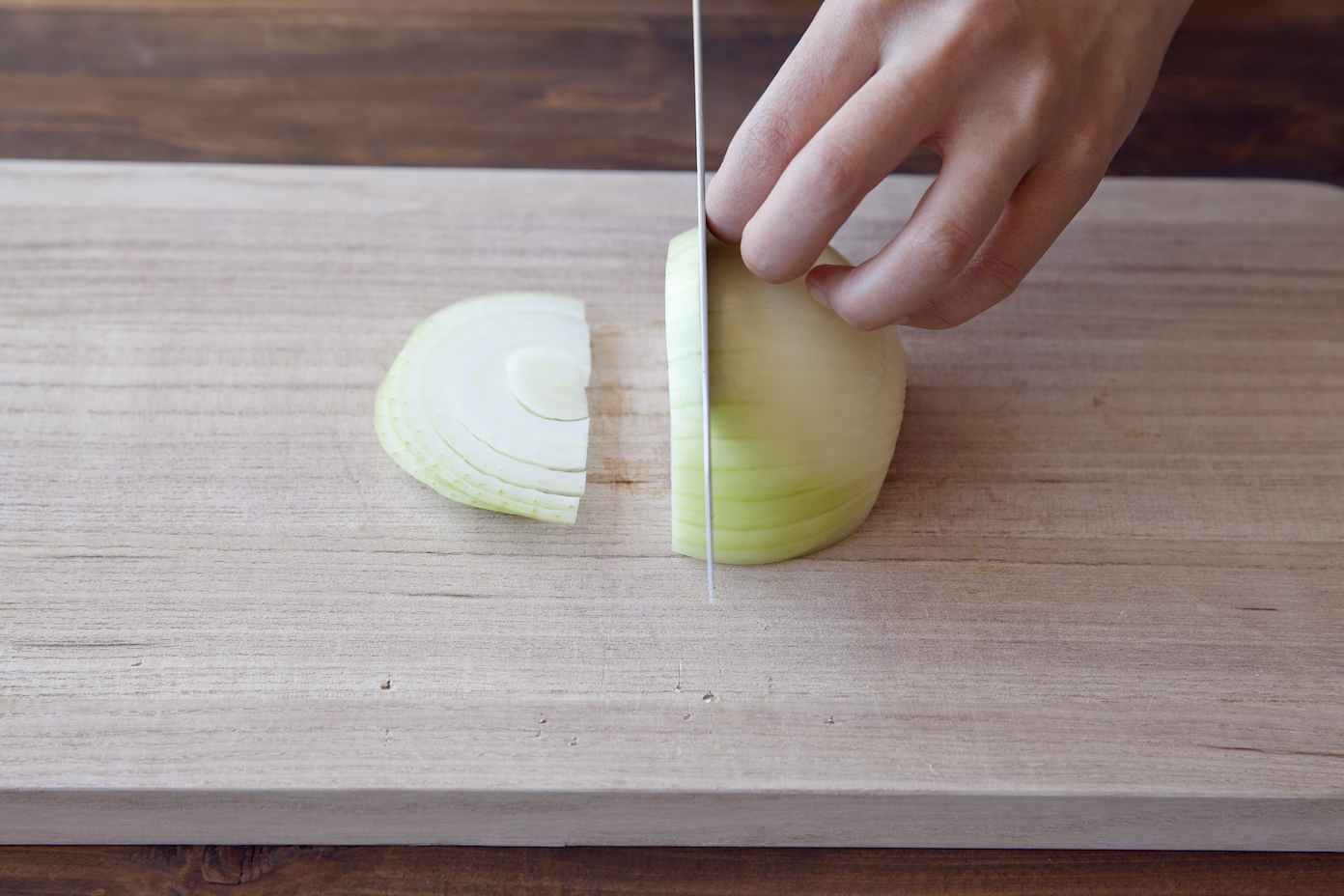 玉ねぎは繊維に逆らって1cm幅に切り、にんじんは一口大の乱切りにする。