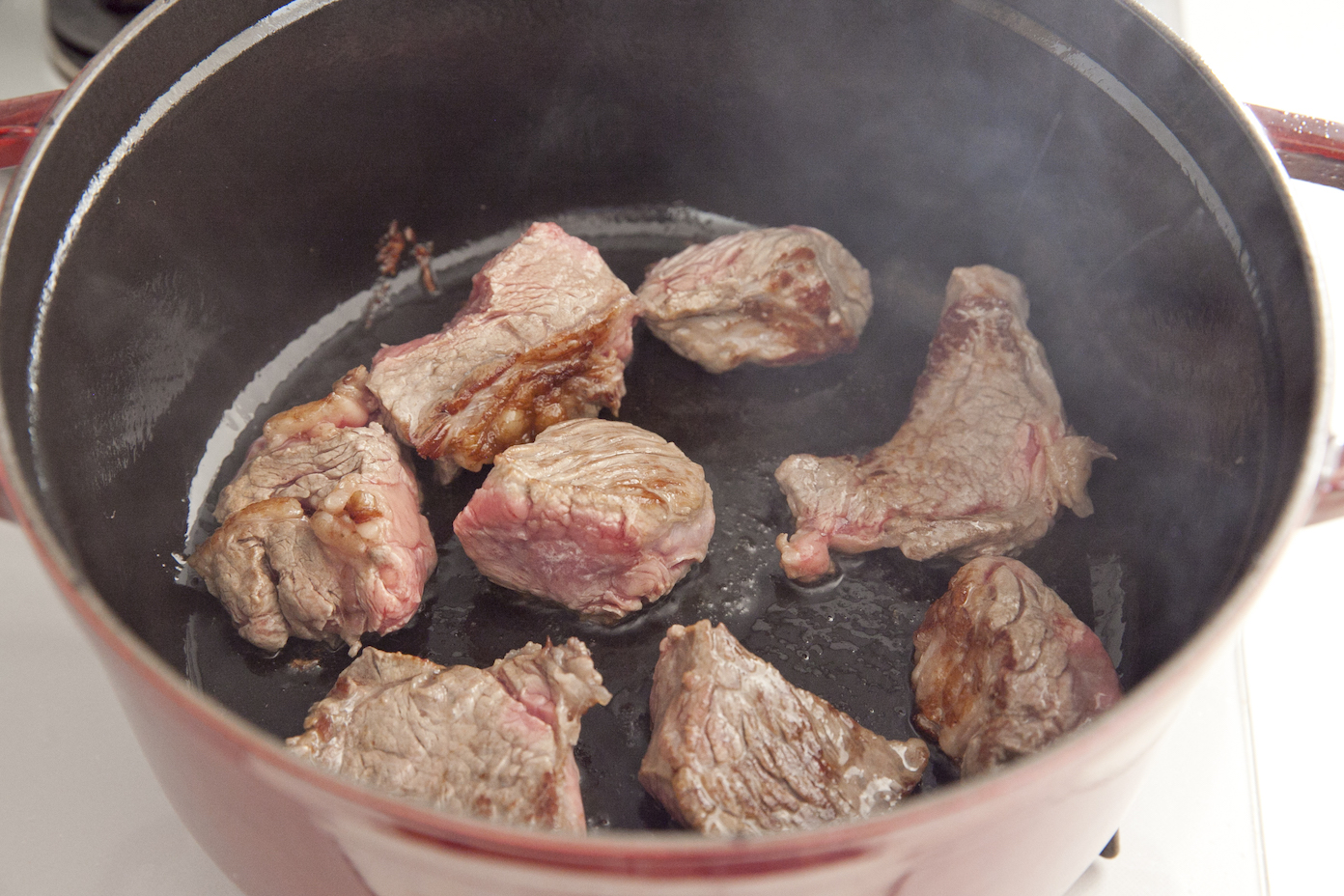 鍋にサラダ油を強火で熱し、牛肉に焼き色をつけて一度取り出す。