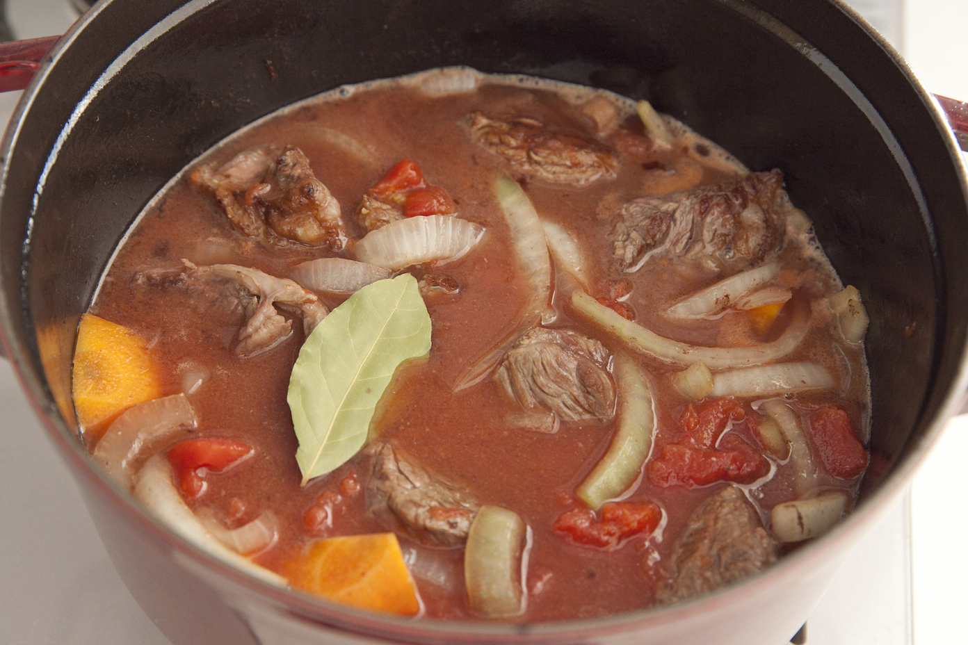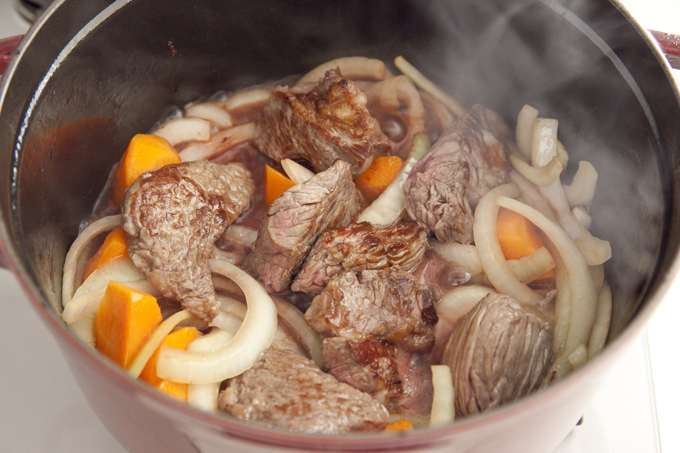 にんじんに油がまわったら牛肉を戻し入れ、赤ワインを加えてアルコール臭さがなくなるまで2分ほど煮立たたせる。