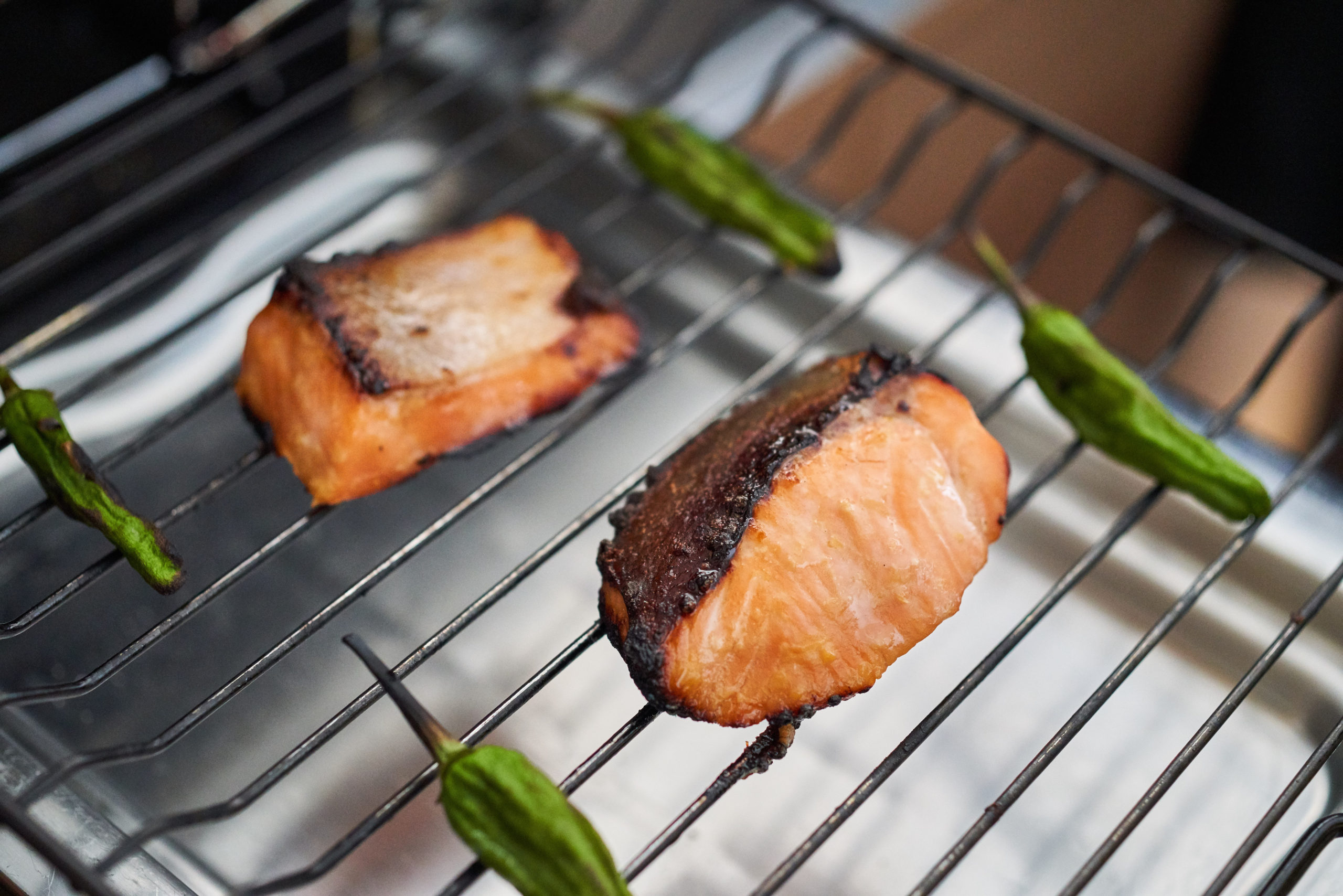 【3】鮭はたれを軽く拭い、ししとうは竹串で穴を数カ所開け、