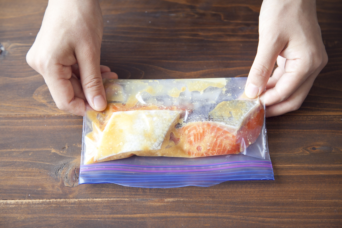 【2】鮭をジッパー付き保存袋に入れ、みそ、みりん、