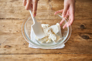 ボウルにクリームチーズ、酒粕を入れ、ゴムベラでなめらかになるまで混ぜ、