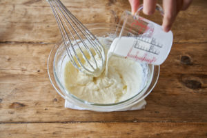 生クリーム、溶いた卵をそれぞれ少しずつ加え、