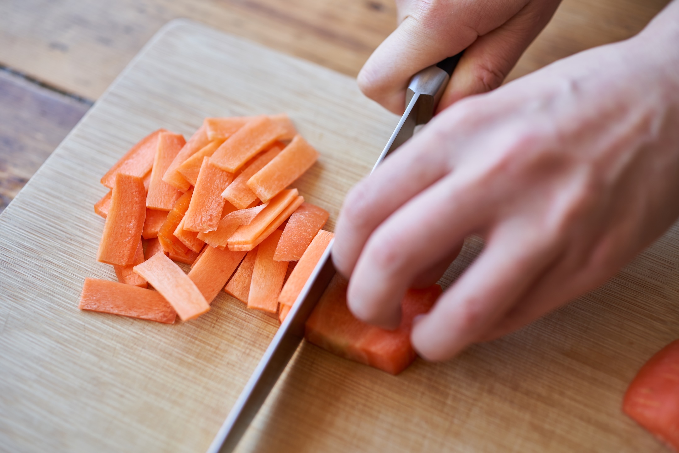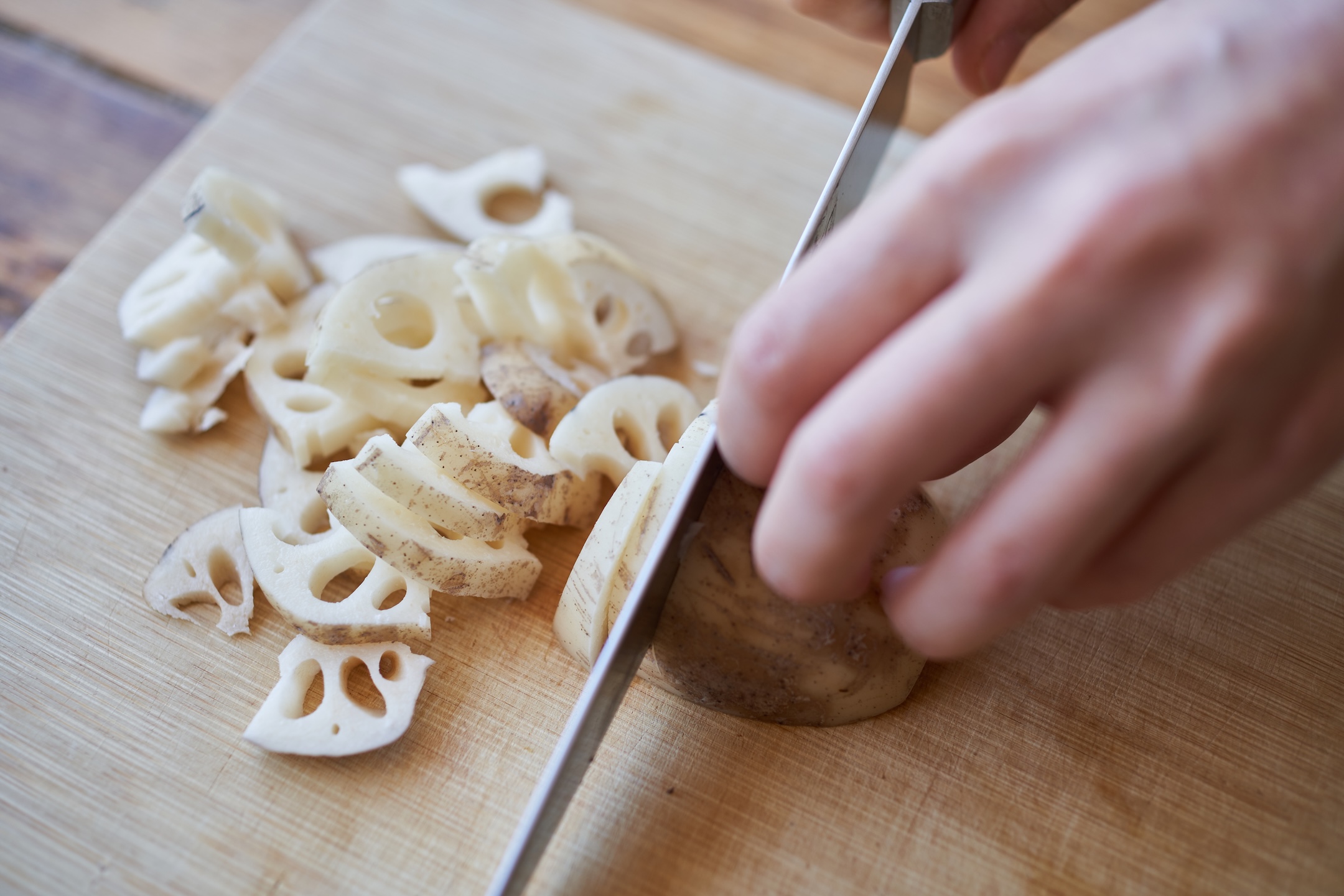 れんこんは皮ごと5mm厚さのいちょう切り、にんじんは短冊切りにする。