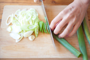 長ねぎは青い部分まで斜め薄切り、しょうがは千切りにする。豚肉は5cm幅に切る。