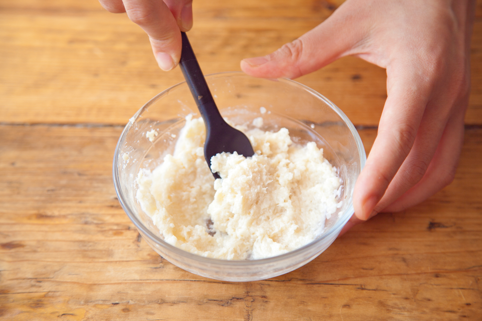 酒粕は耐熱容器に入れて水大さじ1をかけ、ラップをふわりとして電子レンジ600Wで40秒加熱し、混ぜ合わせる。