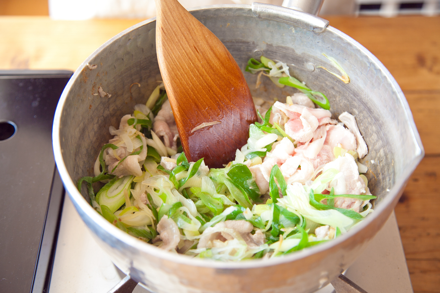 長ねぎは青い部分まで斜め薄切り、しょうがは千切りにする。豚肉は5cm幅に切る。