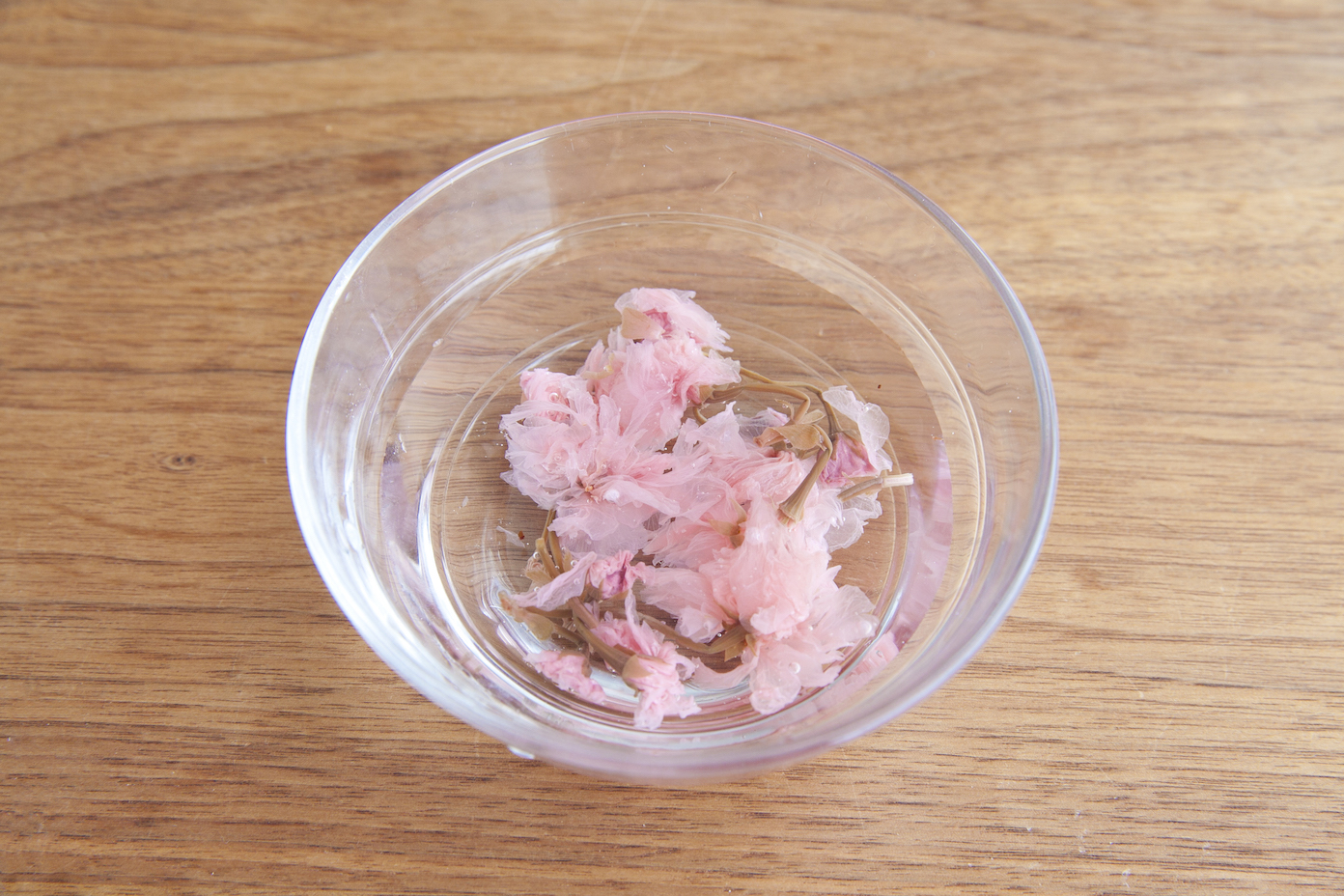 桜の花は塩を洗い流し、5分程度水につけて塩抜きし、水気を拭き取る。