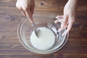 耐熱ボウルに熱湯75ml、道明寺粉、砂糖を耐熱ボウルにいれ混ぜ、