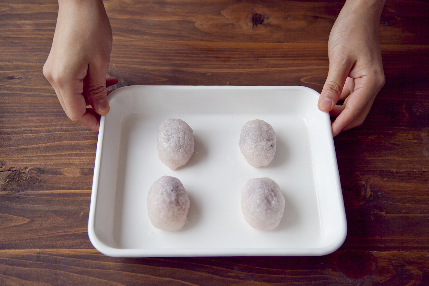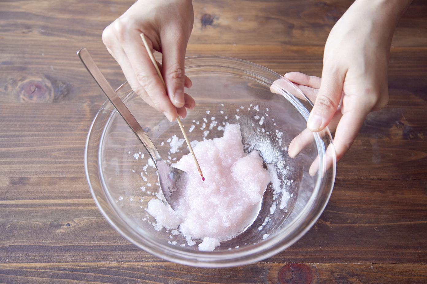 食紅を竹串につけて少しずつ加え淡いピンク色にする。