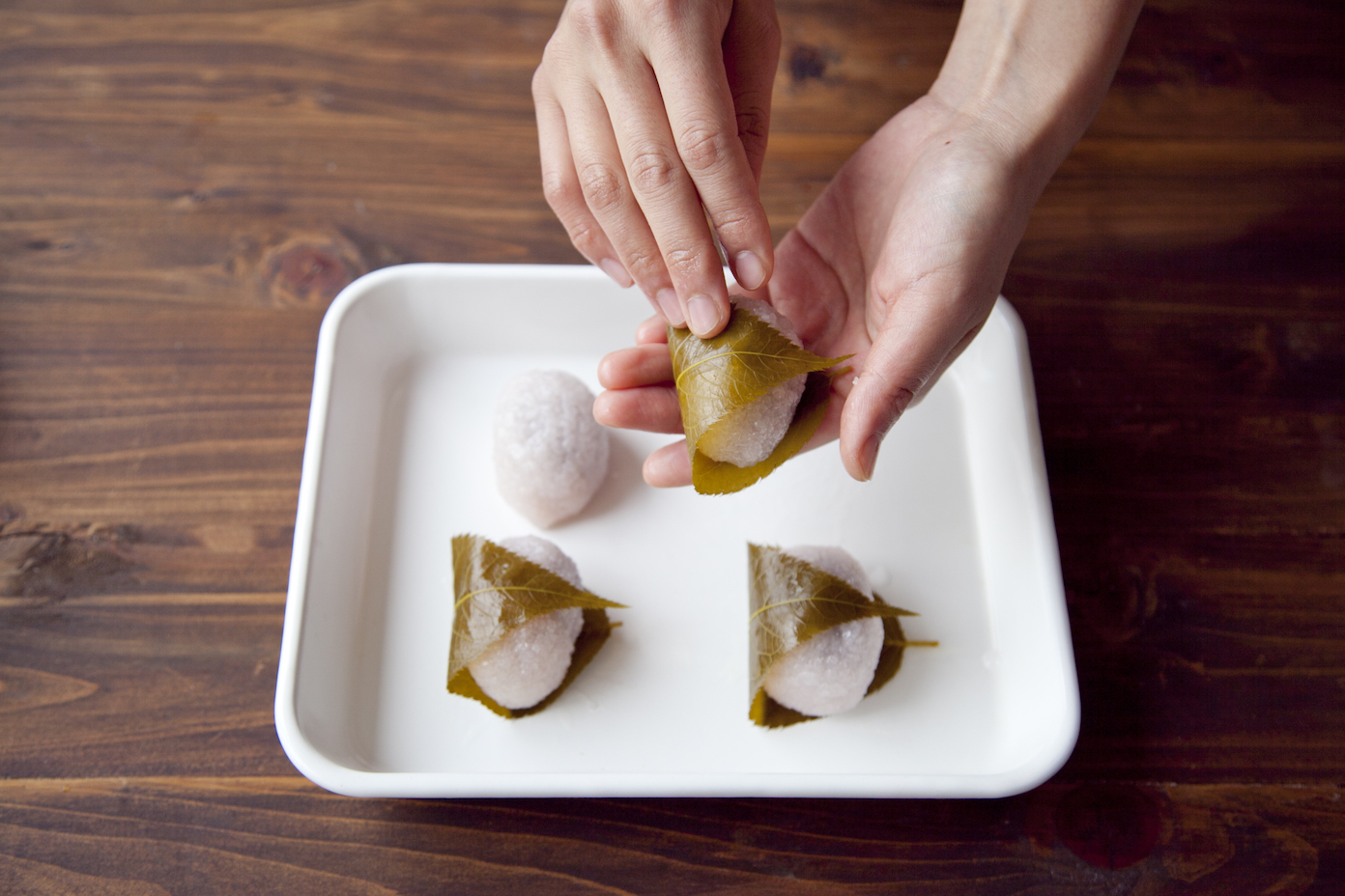 桜の葉の水気を切り、葉脈が浮いているほうを外側にして包む。
