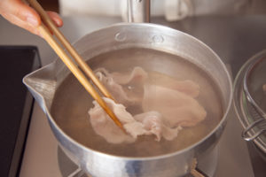 塩(小さじ1程度/分量外)をいれて豚肉を3〜4枚ずつ入れ、