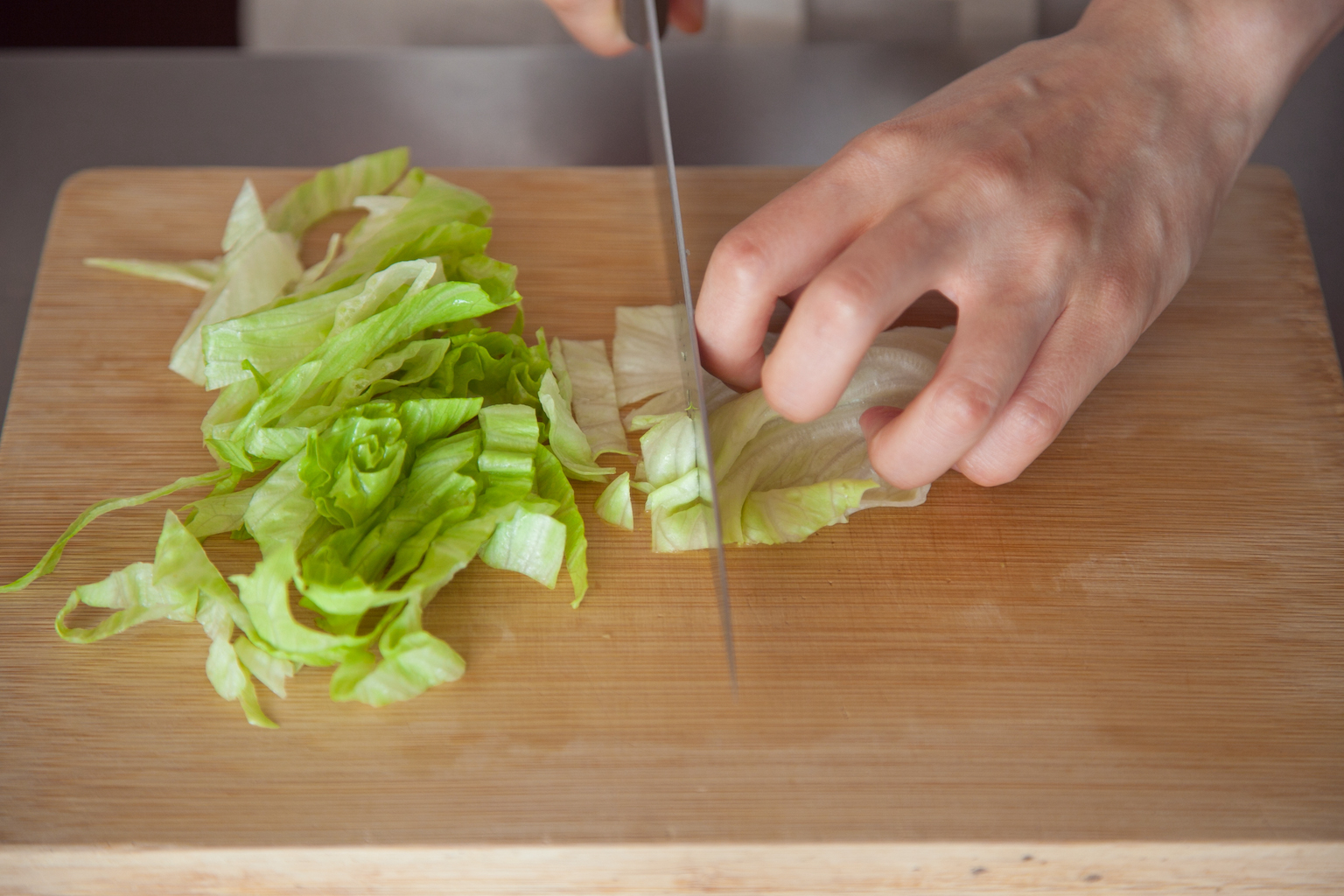 レタスは食べやすい長さの1cm幅に、トマトは1cm角に切る。