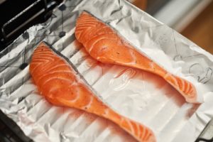魚焼きグリルにアルミホイルをしき、サーモンを入れて3分ほど焼く。