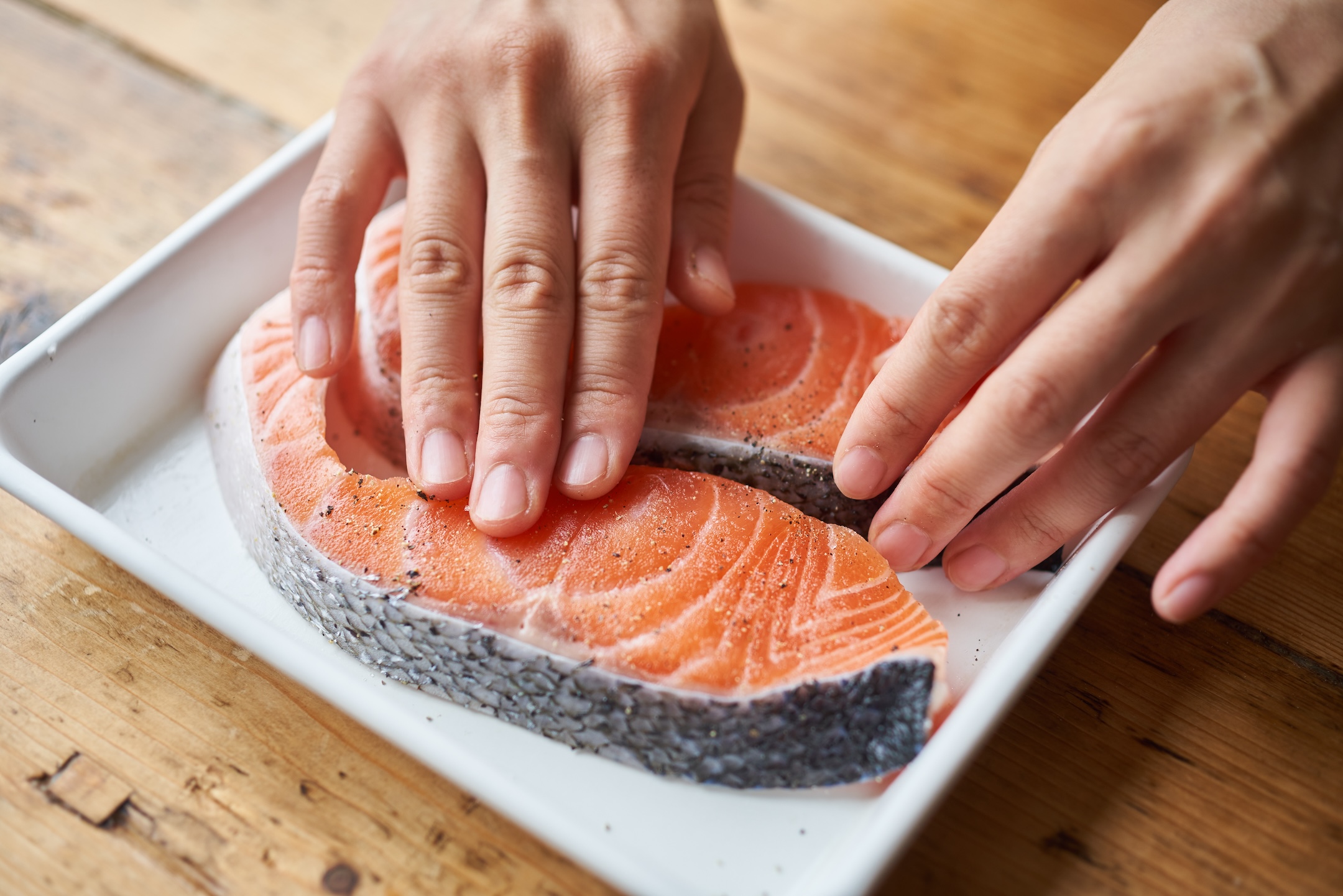 サーモンに塩こしょうをふる。