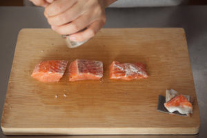 耐熱皿に玉ねぎ、鮭を入れ、残りのオリーブオイルをかけて、