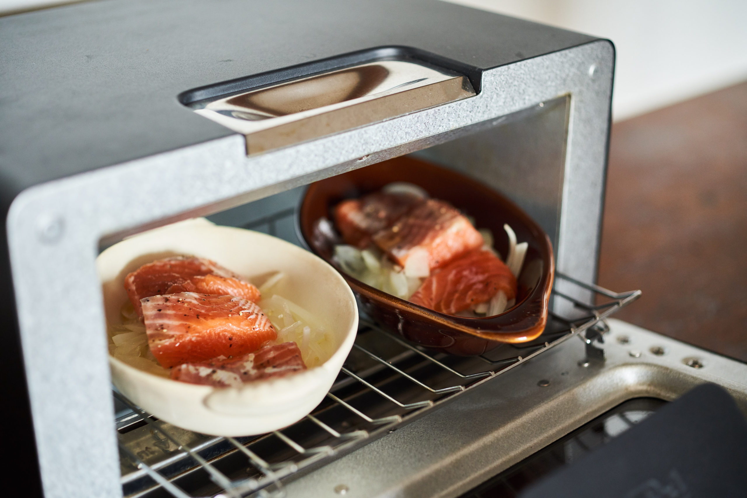 耐熱皿に玉ねぎ、鮭を入れ、残りのオリーブオイルをかけて、