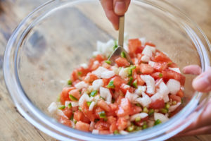 新玉ねぎ、トマトは1cm角、ピーマンは粗みじん切り、