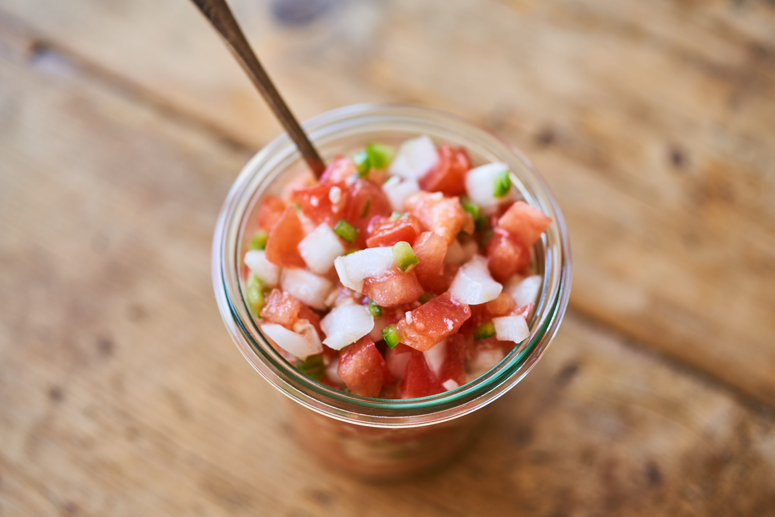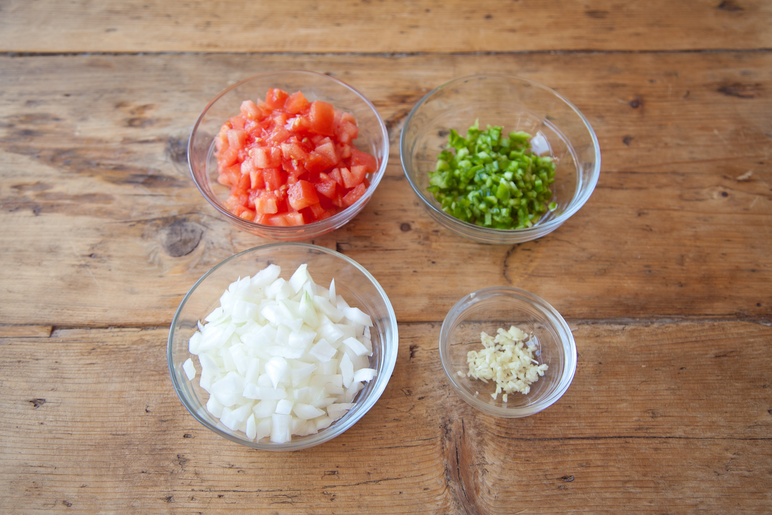 新玉ねぎ、トマトは1cm角、ピーマンは粗みじん切り、