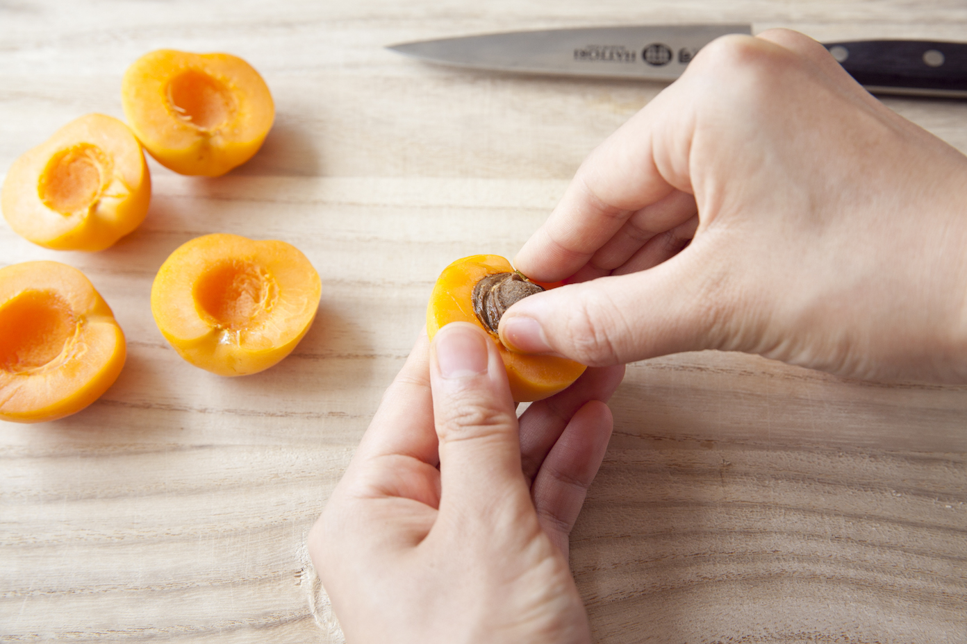 あんずは割れ目に沿って包丁で一周切れ目を入れ、ねじるように二つに分ける。