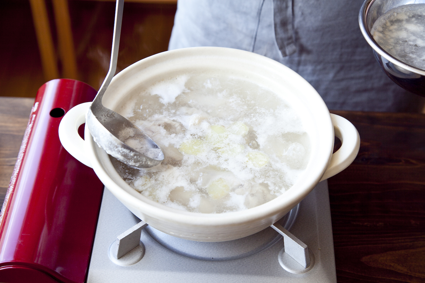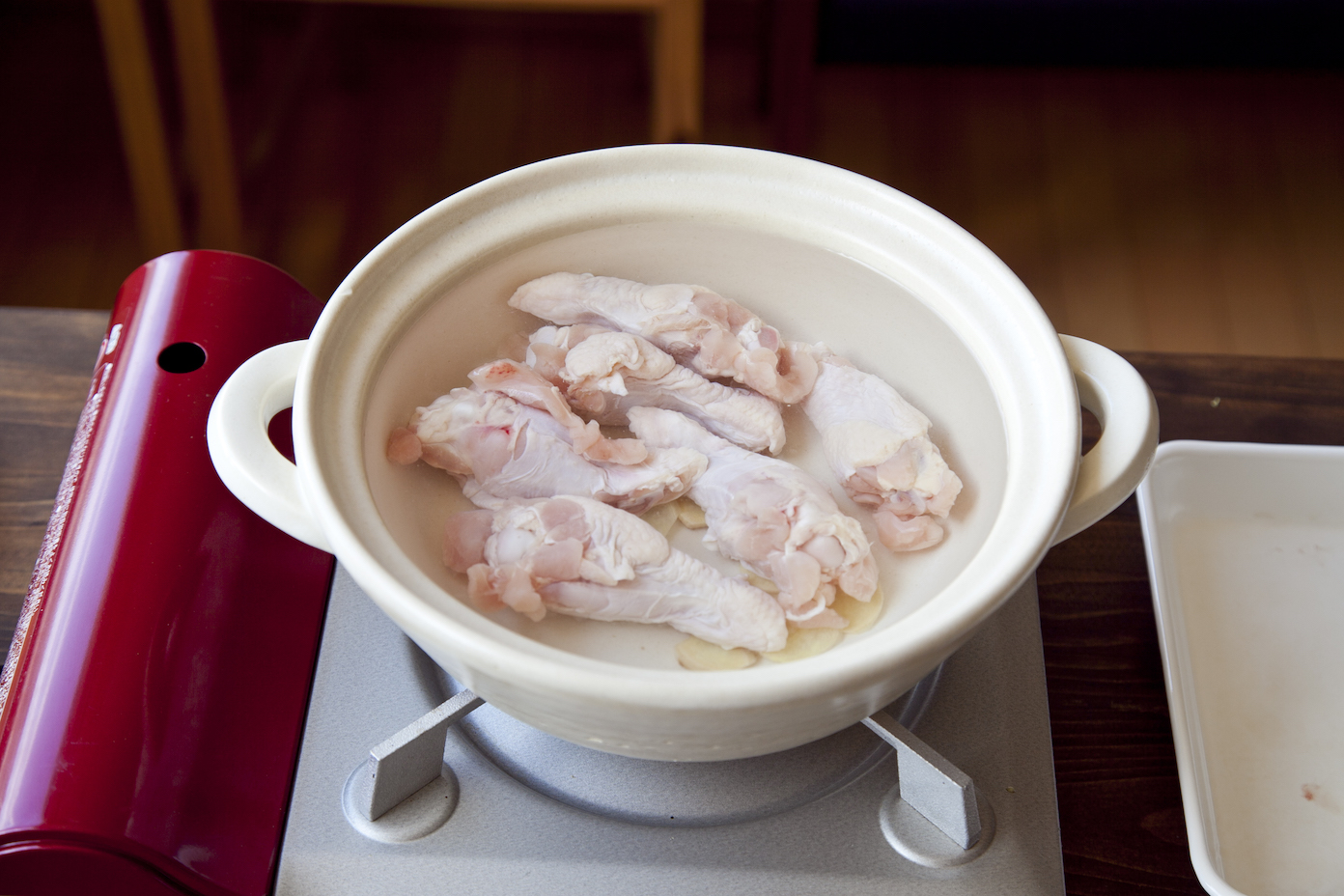 土鍋に水1リットル、鶏手羽元、しょうがを中火にかける。