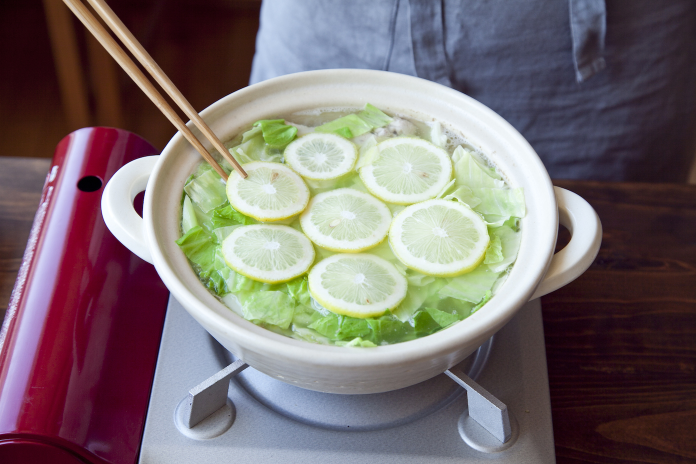 国産レモンと冬に甘みが増すキャベツを使った塩レモン鍋です。