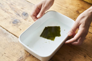 昆布に切り込みを入れて容器に入れ、水3カップを注いでおく。