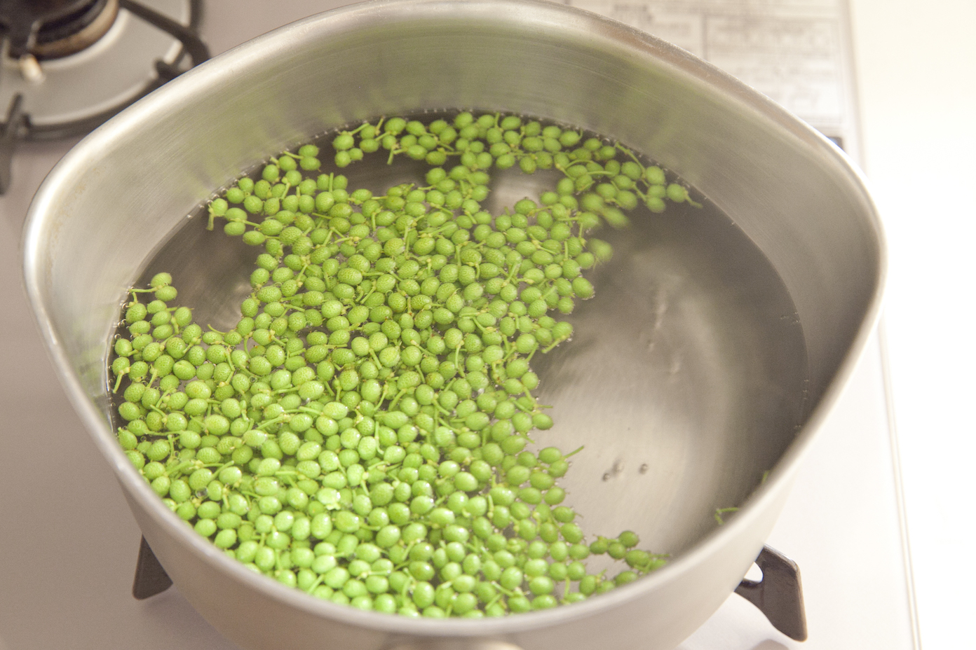 たっぷりの湯を沸かし塩を加え山椒を7分程度茹で、冷水に入れて1時間おいてアクを取る。